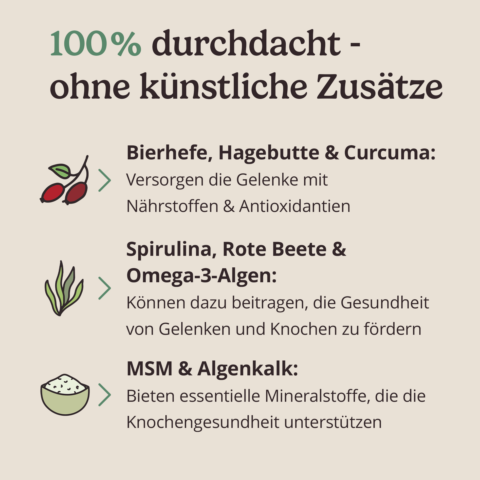 Mit Bierhefe, Hagebutten und Curcuma als nährstoffreiche Unterstützung, ohne künstliche Zusätze.