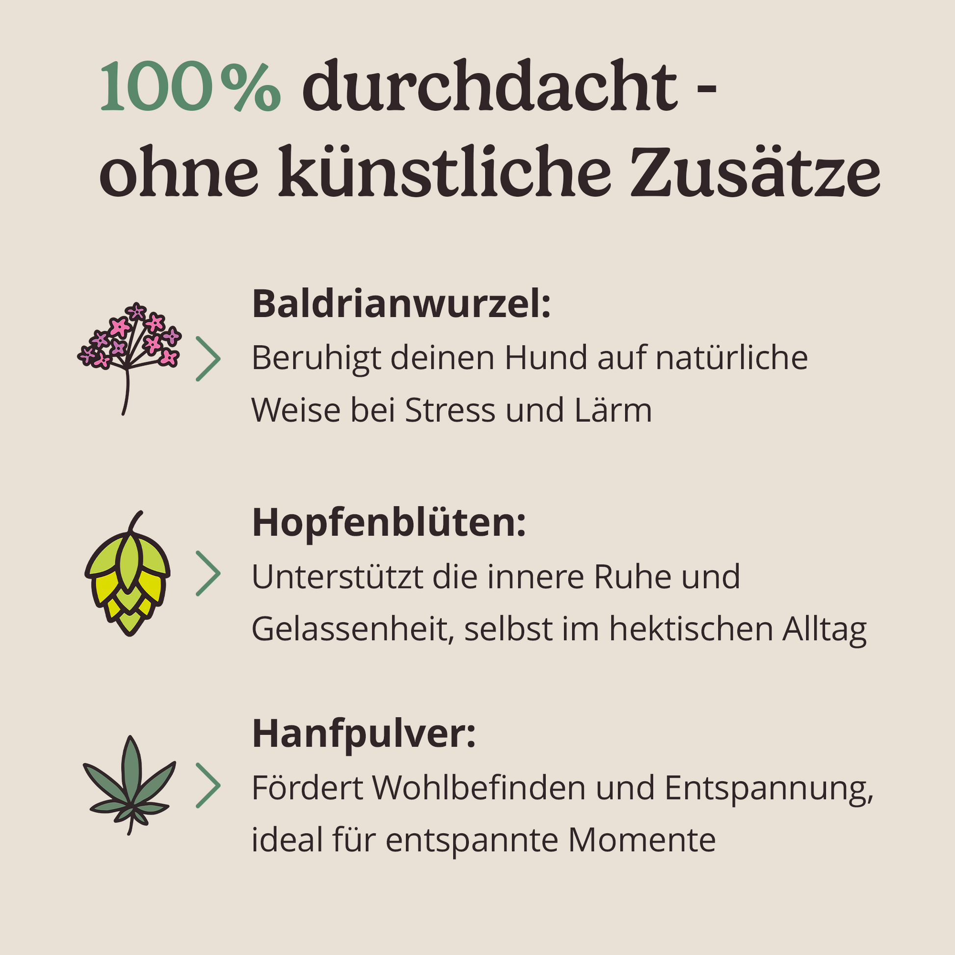 Nur hochwertige, pflanzliche Inhaltsstoffe wie Baldrian und Passionsblume, die deinem Hund das Beste aus der Natur bieten.