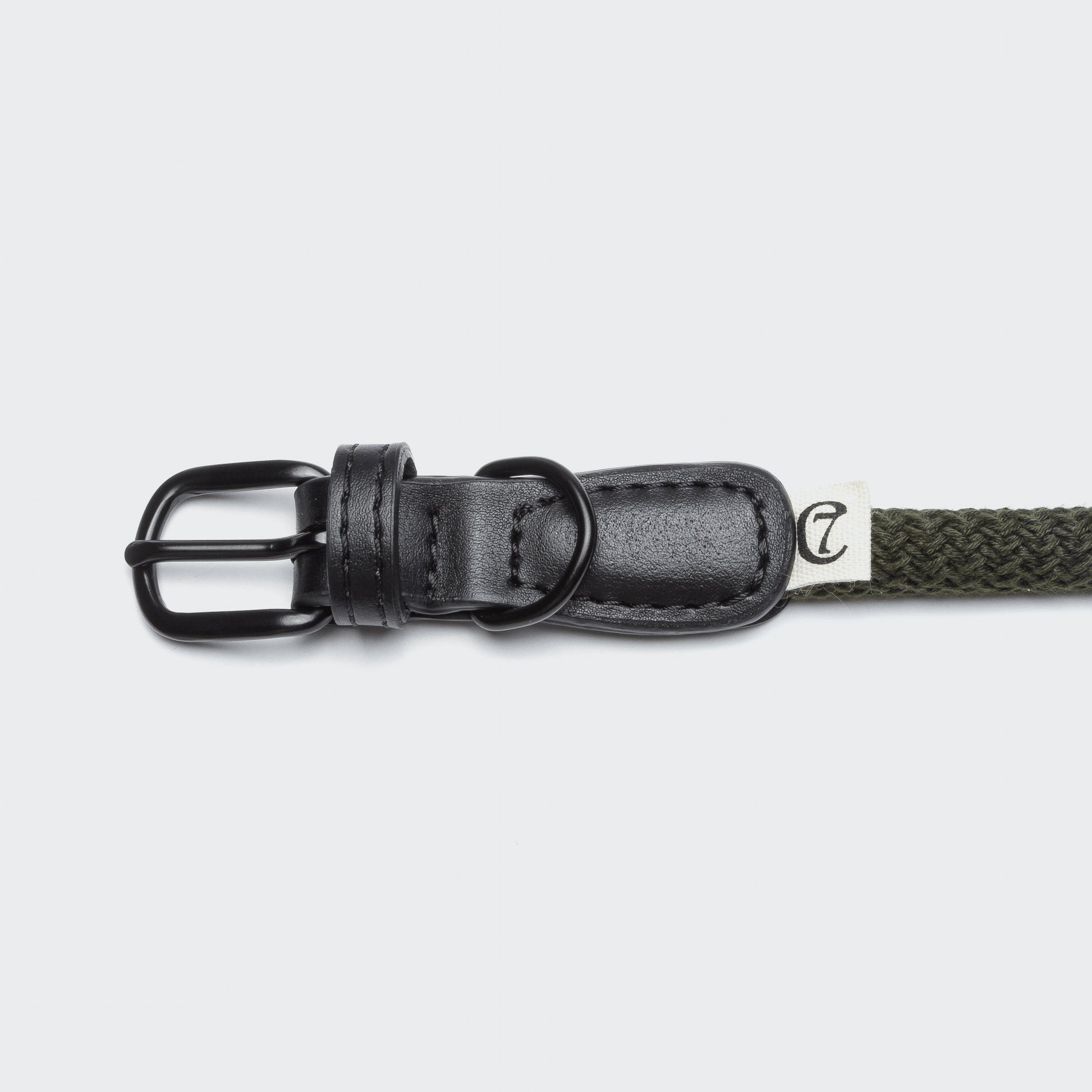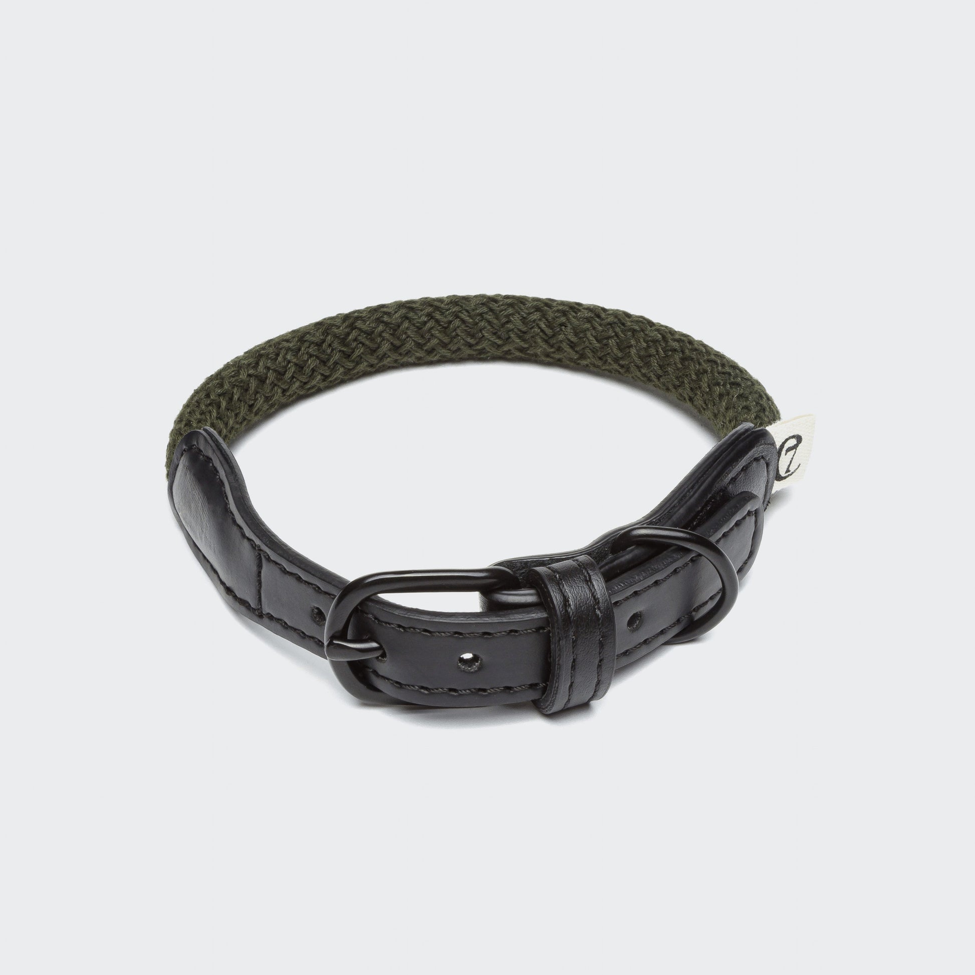 Veganes Seilhalsband für Hunde in Oliv kombiniert mit schwarzem Kaktus-„Leder“ und mattschwarzen Details aus Stahl.