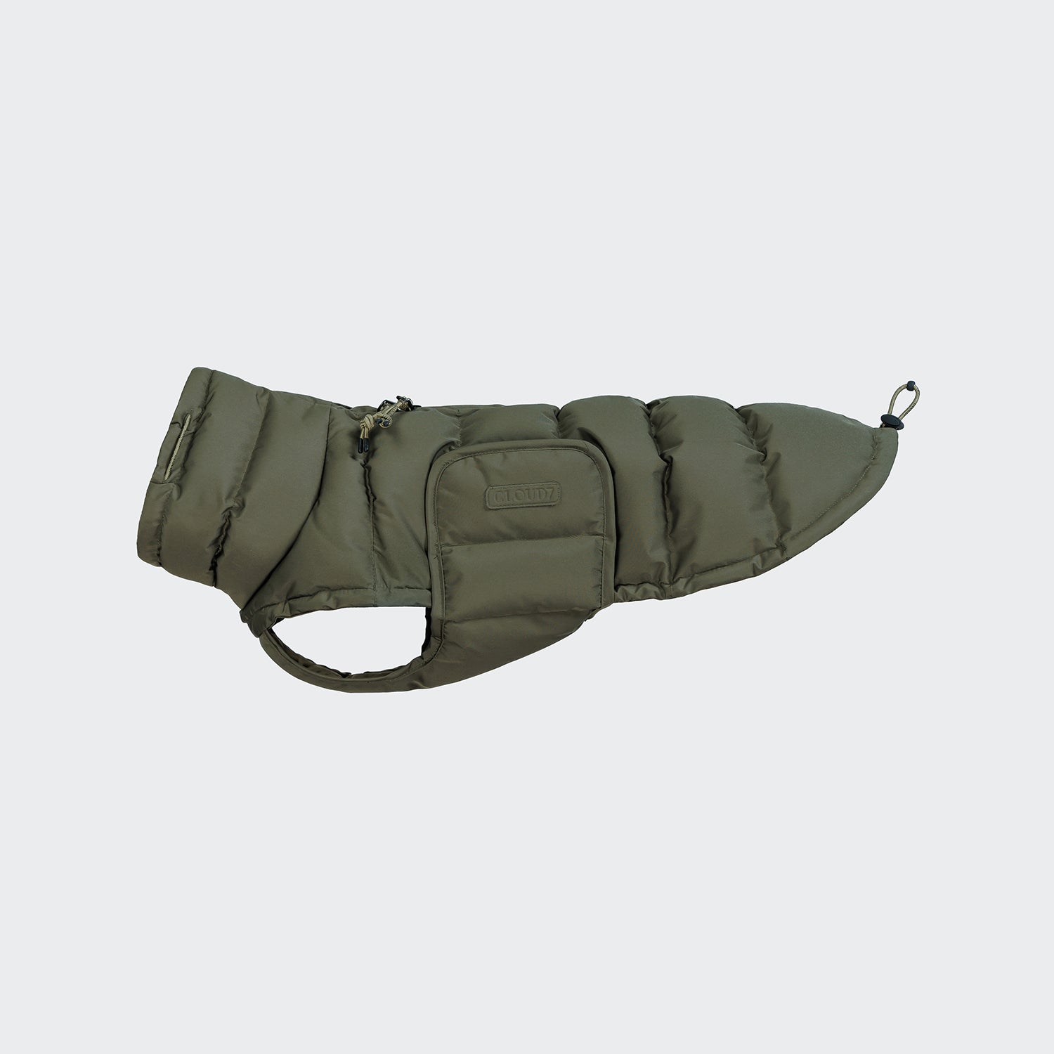 Veganer Dackelmantel aus 100% nachhaltigen Materialien. Der extra warme Wintermantel für Dackel in zeitlosem Light Olive ist anstelle von Daunen mit Eco Puffer aus recycelten PET-Flaschen gefüttert.