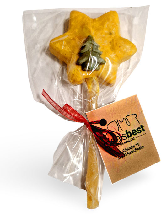 Zusammensetzung: Dinkelmehl, Reismehl, Leberwurst, Karotten, Ei, u.a. verziert mit spezieller Hundeschokolade*.